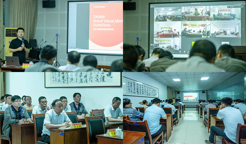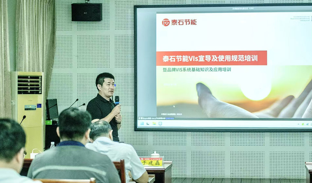 拍摄杀青,我们创作的全新品牌视觉识别系统VIS也已经完成最终定稿,并交付精美的印刷品手册。8月23日,按照计划,于建磊老师在泰安总部为相关人员,进行了“新品牌、新理念、新形象”的泰石节能品牌视觉识别宣导仪式。会议现场也通过直播的方式让其它六大基地的品牌相关人员共同参与。品牌视觉识别系统宣导后,各项工作有序推进,比如建筑空间、大门等逐项改造升级。